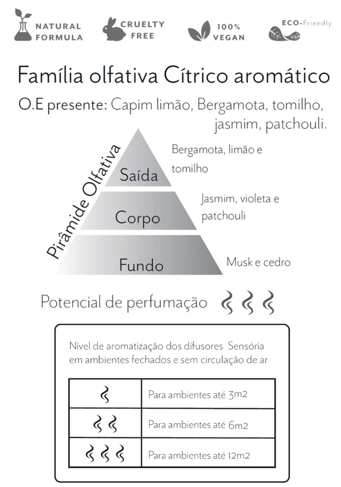 Com a presença revigorante do capim-limão combinada a notas cítricas e florais delicadas, este difusor leva frescor, leveza e elevação para qualquer ambiente. Um verdadeiro tributo à generosidade da natureza e à beleza que tira o fôlego.