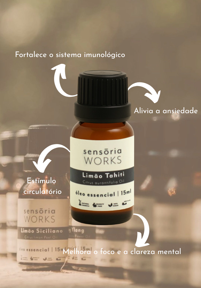 O óleo essencial de Limão Tahiti é um convite para clarear a mente e renovar a energia. Seu aroma leve e cítrico estimula o foco, traz sensação de frescor e melhora o humor quase de imediato. É aquele toque que desperta, organiza os pensamentos e ajuda a enxergar as coisas com mais racionalidade.